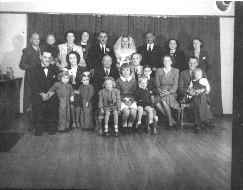 Agter van links na regs: Theo Scheepers (swaer), kind waarskynlik Hendrik Scheepers, Magriet Scheepers (geb. Kruger, Theo se vrou), Onbekend, Petrus (PK) Kruger (swaer) en bruid Kosie Theron (skoonsuster), Walter (Boet) Kruger (swaer) en Stompie ?? (Kruger, Boet se vrou), Onbekend,