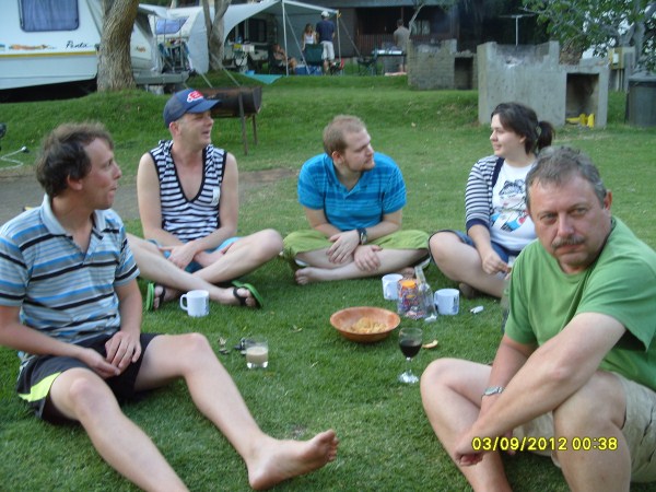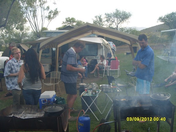 Stuk-stuk het die familie begin aankom. Karavane, tente, 4x4’s, ou karre, nuwe (DUUR) voertuie, als wat jy aan kan dink. Sommer gou is gegroet en vure begin aansteek; want sien, selfs ’n worsrol is lekkerder as die worsie gebraai is. Die dapperstes het die water gaan toets – warm- en koud. Tot laaat is gekuier en geskerts om die vure.